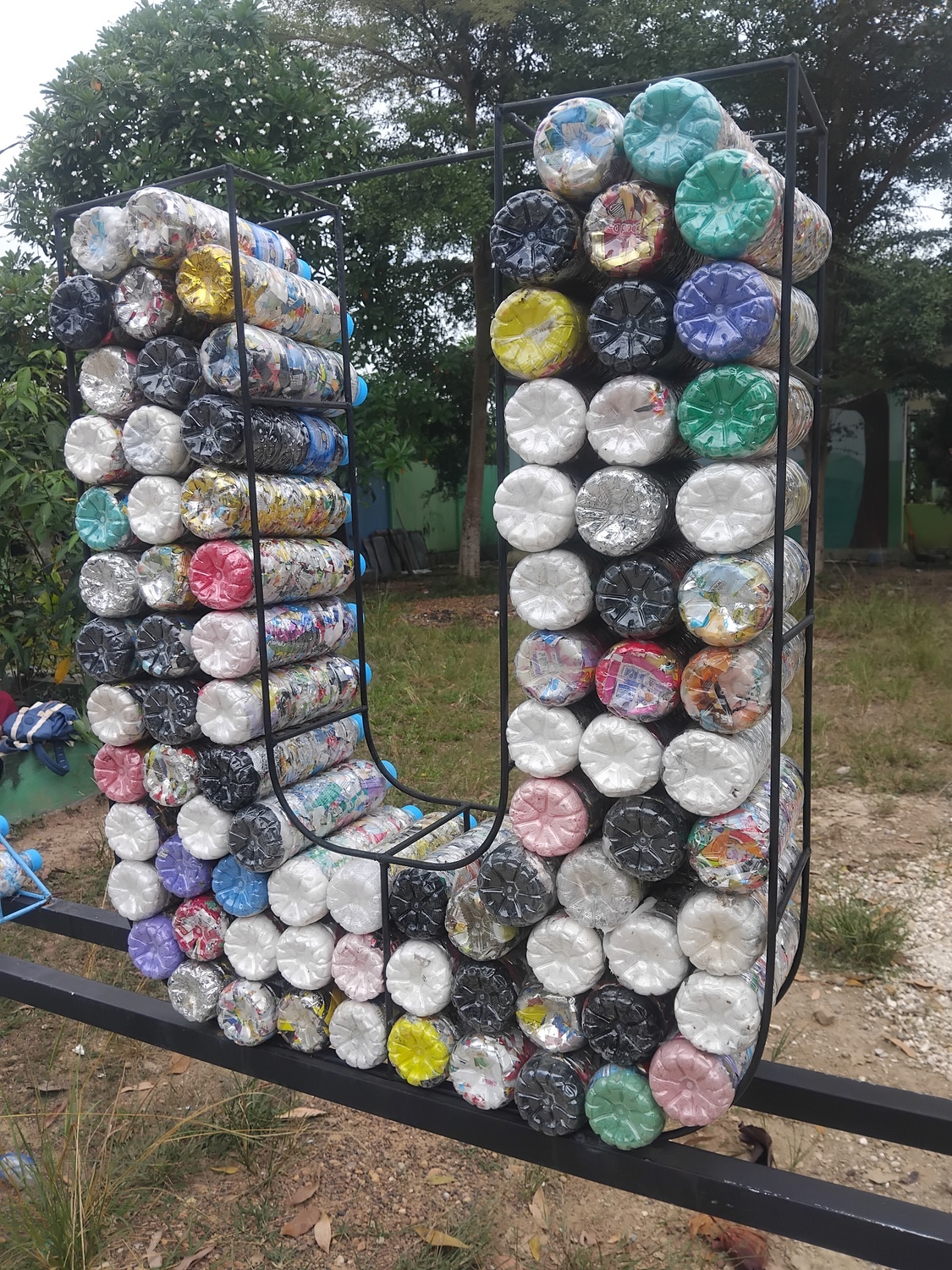 U-shaped structure made from tightly packed plastic bottles held in a metal frame outdoors.