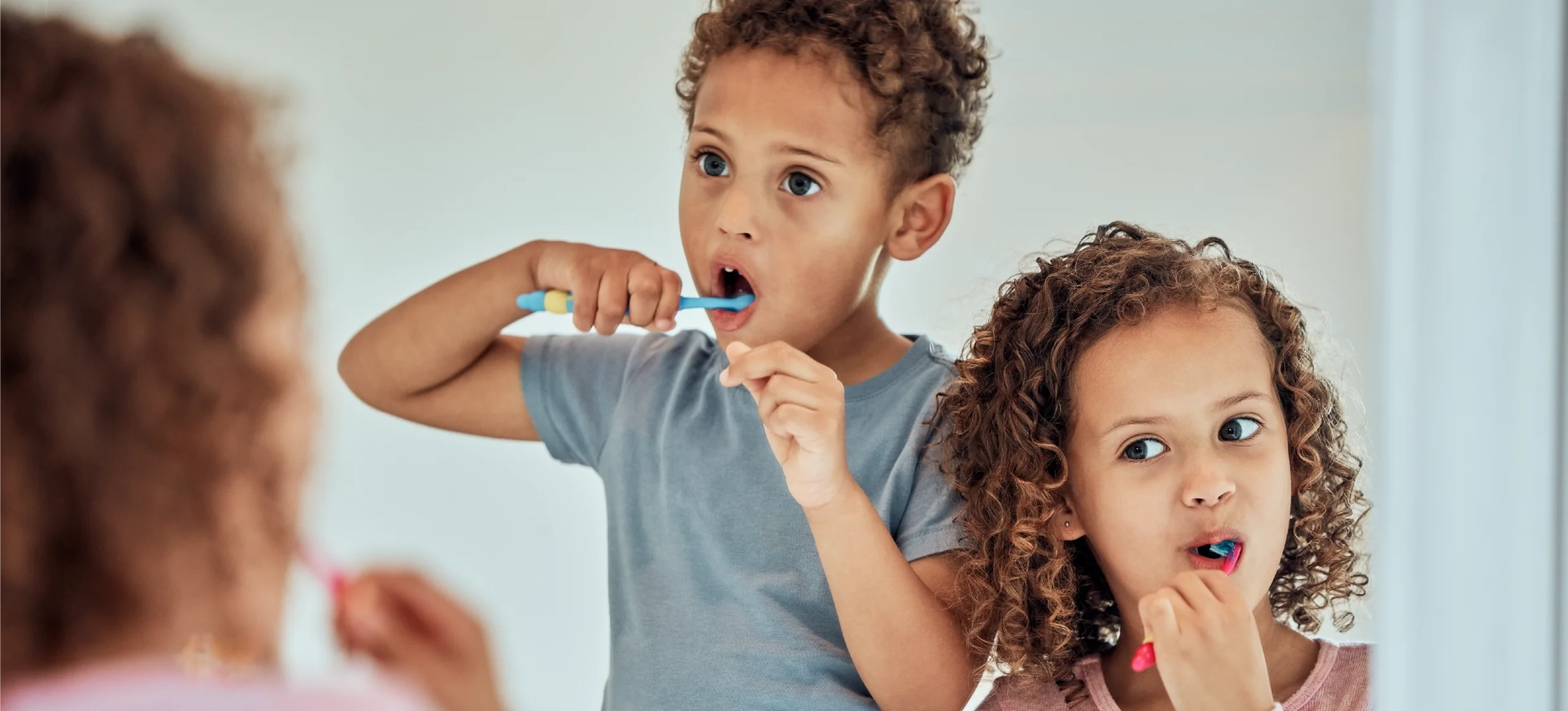 Two young children brushing their teeth infront of a mirror.