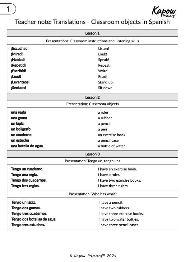 Knowledge organiser: Spanish – Classroom objects